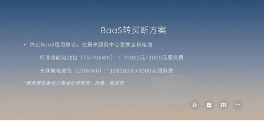 蔚来将推出BaaS转买断方案 需支付服务费和全额电池款日前,我们从蔚来APP社区了解到,蔚来官方账号“用户大当家”确认,蔚来将推出BaaS转买断方案,但尚未公